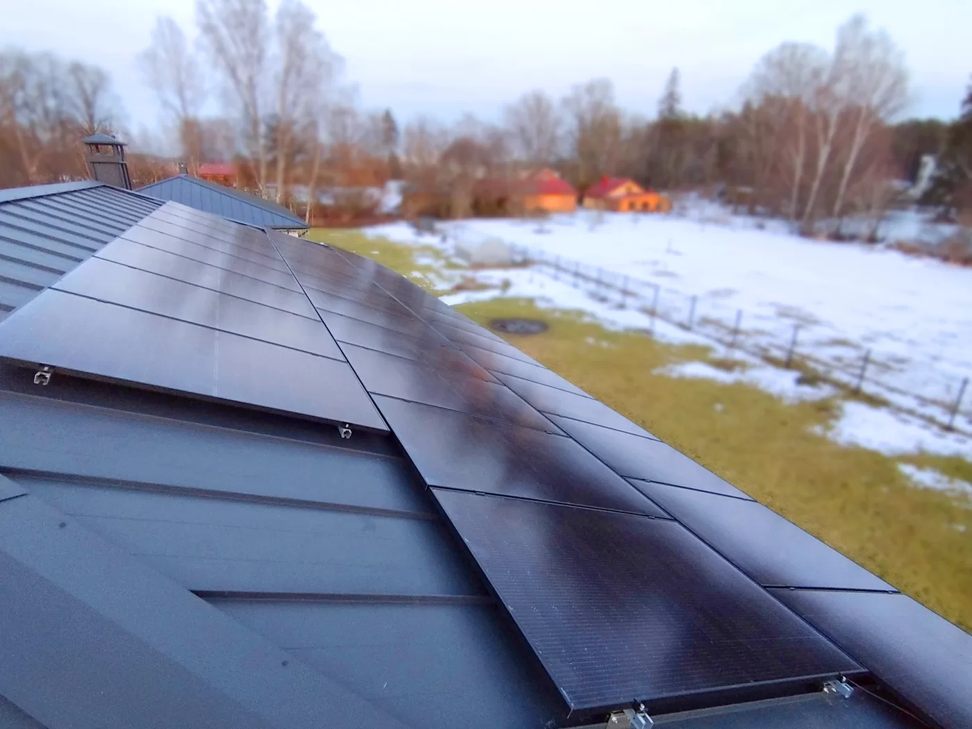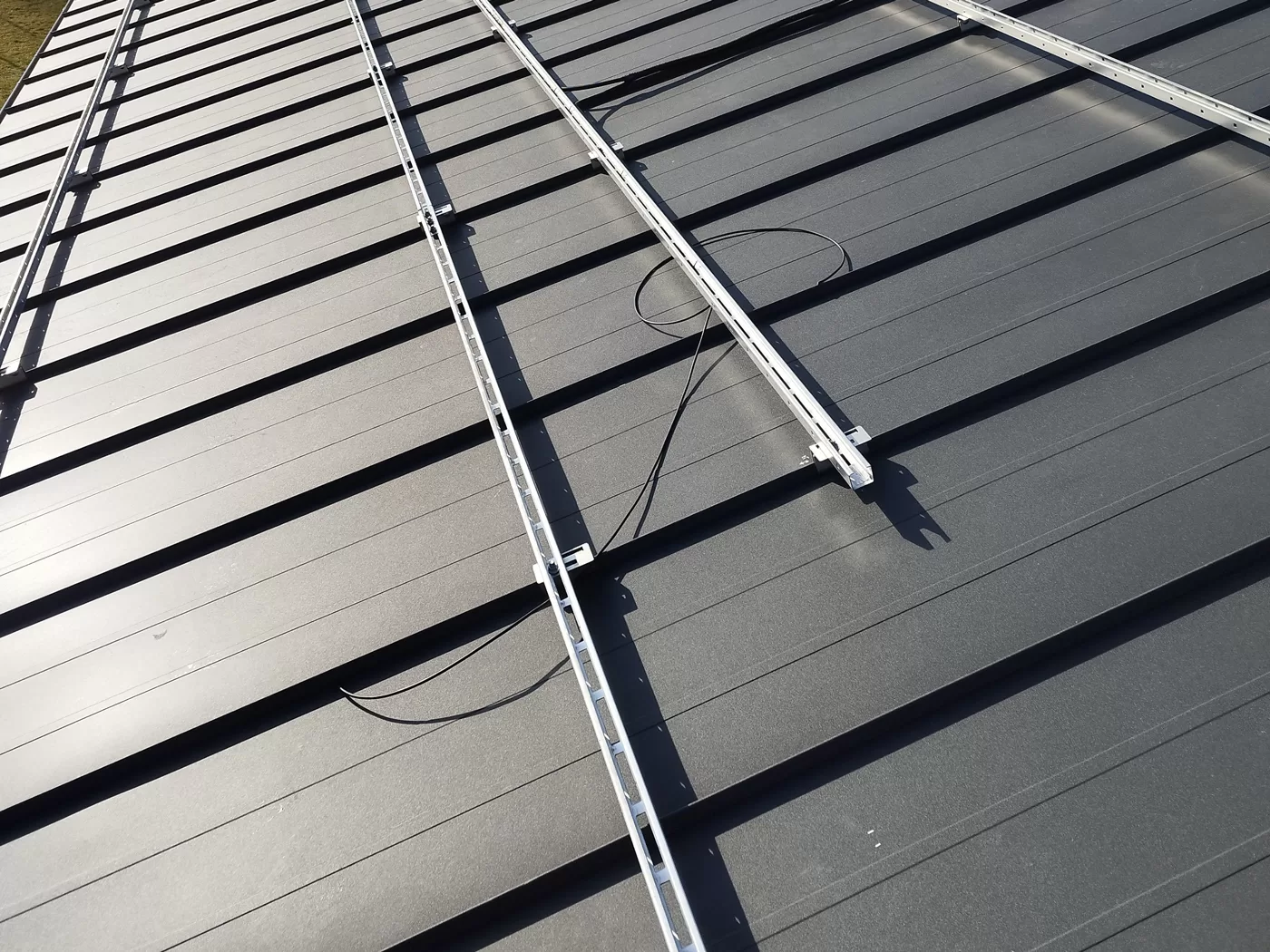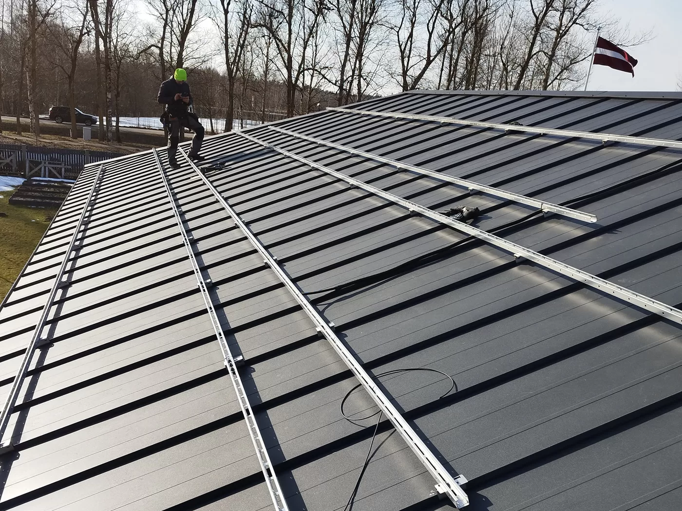 Privātmāja ar valcprofila jumtu. Jumtiem izmantojam oriģinālos “Baks” stiprinājumus priekš valcprofila. Papildus klients vēlējās izveidot zemējuma kontūru un solāro pārsprieguma aizsardzību.